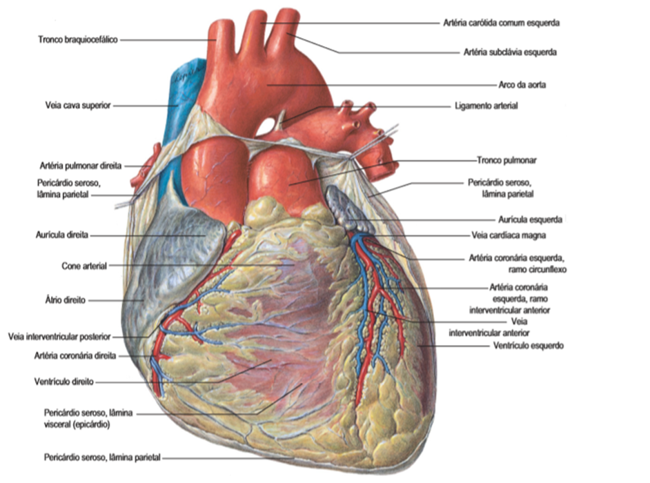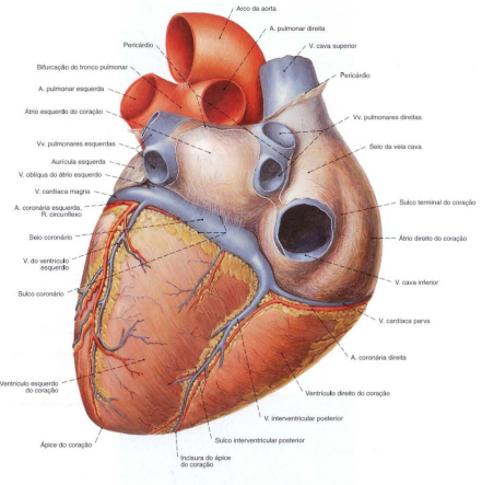 O coração possui uma face esternocostal já que o esterno e as costelas estão na sua frente; uma face pulmonar, área lateral em que os pulmões mantém contato com o coração ao envolvê-lo e uma face diafragmática, correspondendo à superfície inferior em que o coração repousa sobre o diafragma. Na visão anterior do coração pode ser visto o tronco pulmonar e, posteriormente, a artéria aorta. Já na visão posterior do coração, visualizamos as veias cavas e as veias pulmonares.