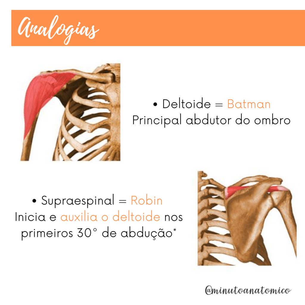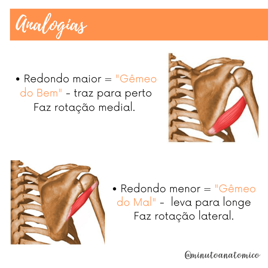 As regras mnemônicas e demais analogias são corriqueiramente utilizadas na Anatomia Humana a fim de facilitar o entendimento do assunto. A seguir, são apresentadas estratégias de memorização voltadas para os músculos do ombro, abrangendo ações e inserções de cada um, desenvolvidas pelos monitores de Anatomia Humana do Departamento de Morfologia da UFRN. Confira abaixo o post sobre manguito rotador retirado de @minutoanatomico.