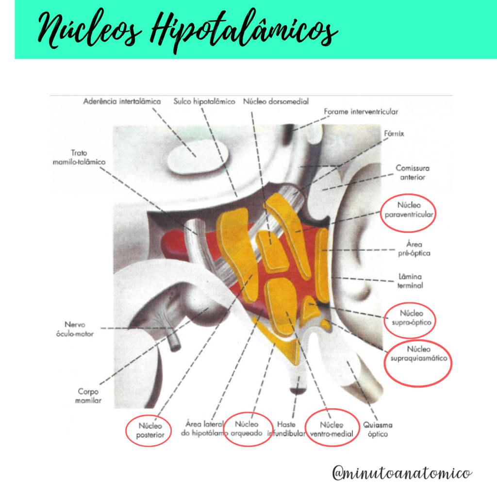Suas formações anatômicas facilmente discerníveis são: quiasma óptico, túber cinéreo, infundíbulo e os corpos mamilares. Tais regiões anatômicas apresentam concentrações de corpos celulares que compõem os chamados “núcleos hipotalâmicos”, responsáveis pela funcionalidade do hipotálamo.