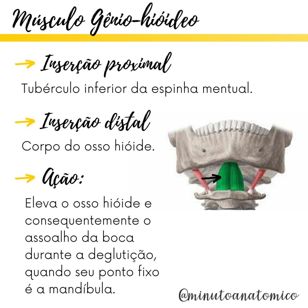 - O músculo gênio-hióideo, além de elevar o osso hioide e o assoalho durante a deglutição quando fixado à mandíbula, atua juntamente com a musculatura infra-hióidea, tornando-se abaixador da mandíbula e auxiliando o VA do digástrico no movimento de abertura inicial da boca.