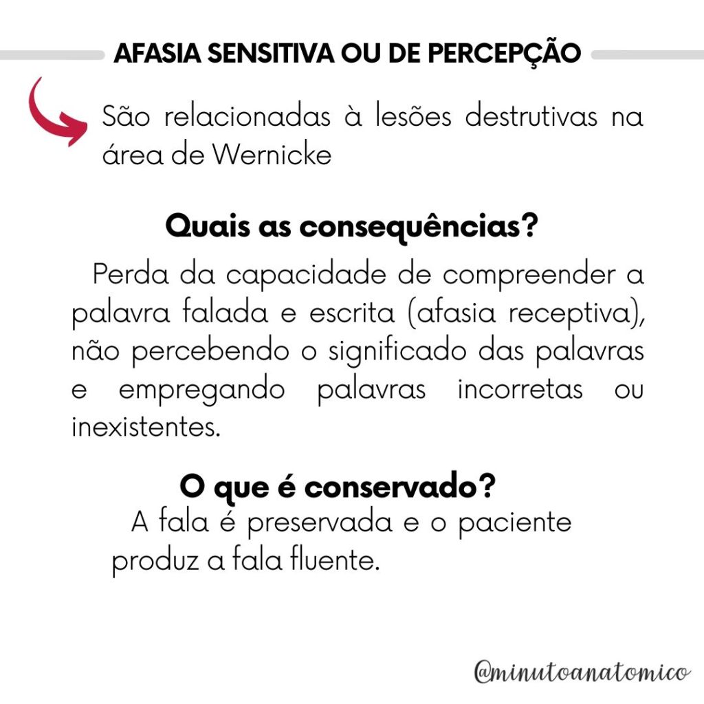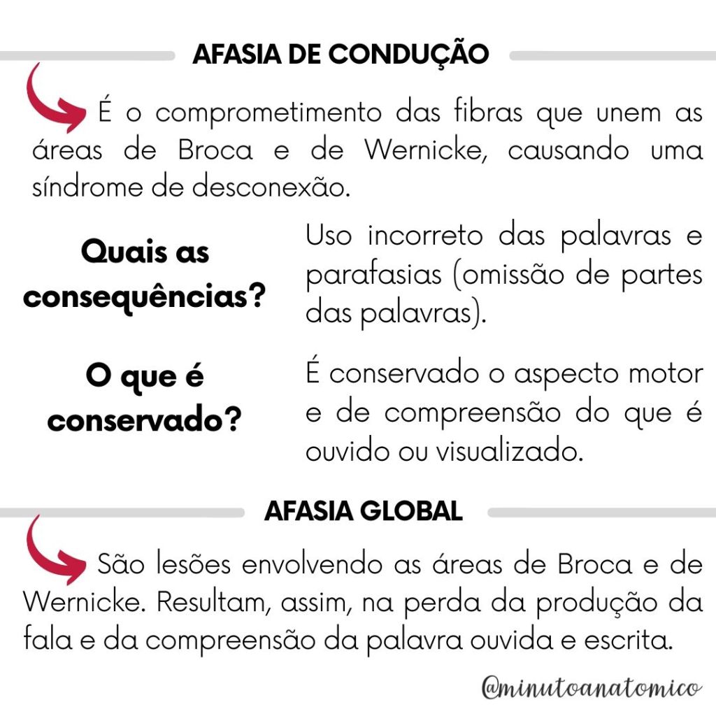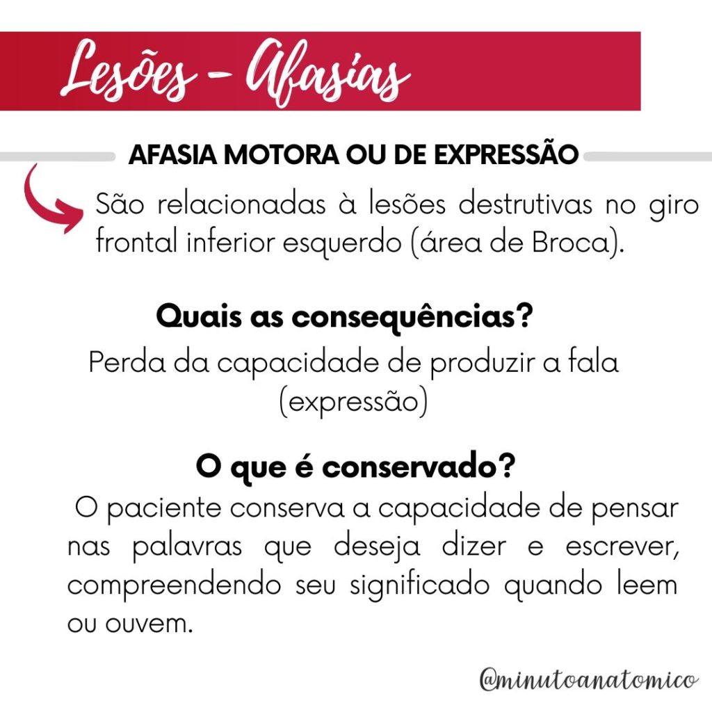 Além disso, lesões nessas áreas dão origem aos distúrbios da linguagem, denominados afasias. Distinguem-se quatro tipos de afasias, sendo elas: Afasia Expressiva, Afasia Sensitiva, Afasia de Condução e Afasia Global. Acompanhe as informações abaixo: