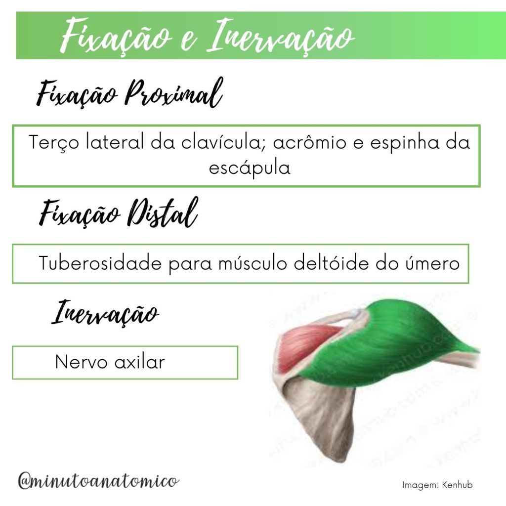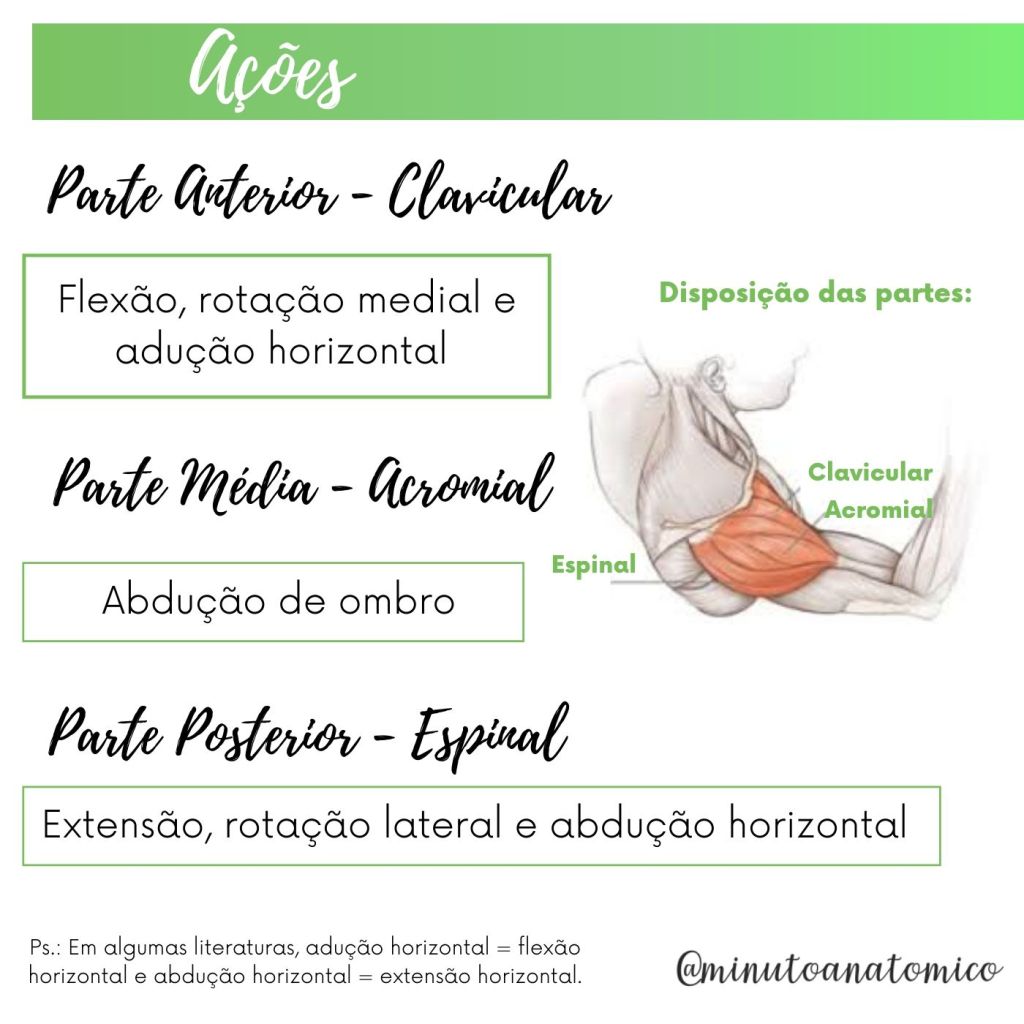 É dividido nas partes anterior (clavicular), média (acromial) e posterior (espinal), sendo sua ação principal a abdução de ombro. No entanto, cada parte possui prevalência em outras ações como a rotação medial e flexão do ombro (clavicular), assim como rotação lateral e extensão do ombro (espinal). O músculo ainda tem outras particularidades: