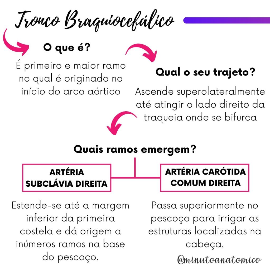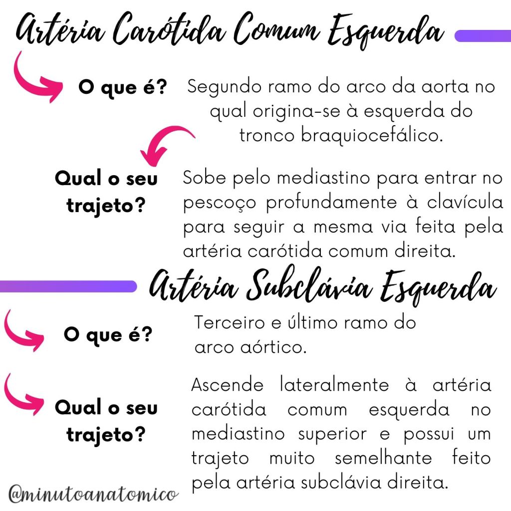 Do arco da aorta emergem três ramos: o tronco braquiocefálico, artéria carótida comum esquerda e artéria subclávia esquerda. Veja mais detalhes nas figuras abaixo:
