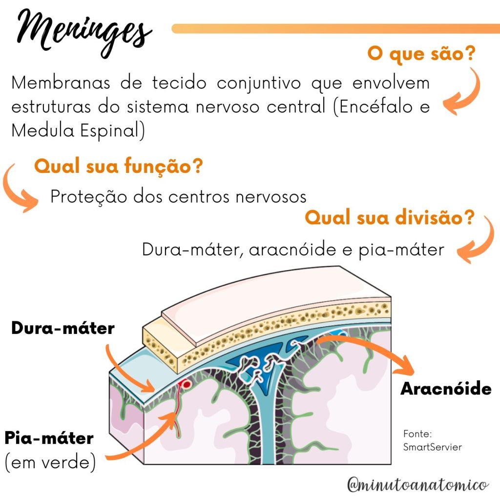 Você conhece as meninges e suas funções? Trata-se de três estruturas que revestem o sistema nervoso central (SNC): dura-máter, aracnoide e pia-máter Veja mais informações a seguir: