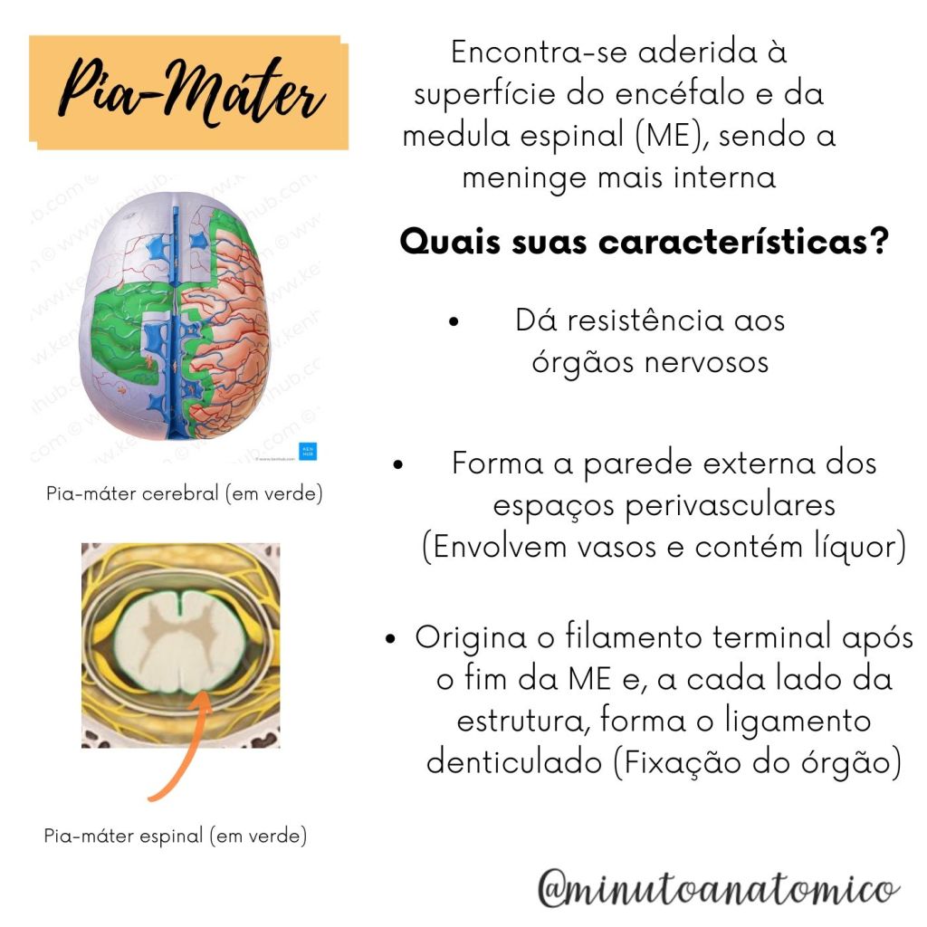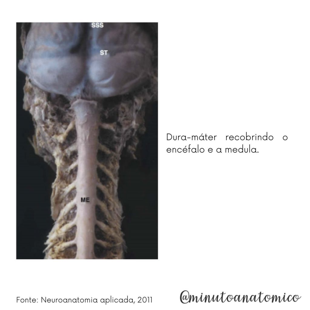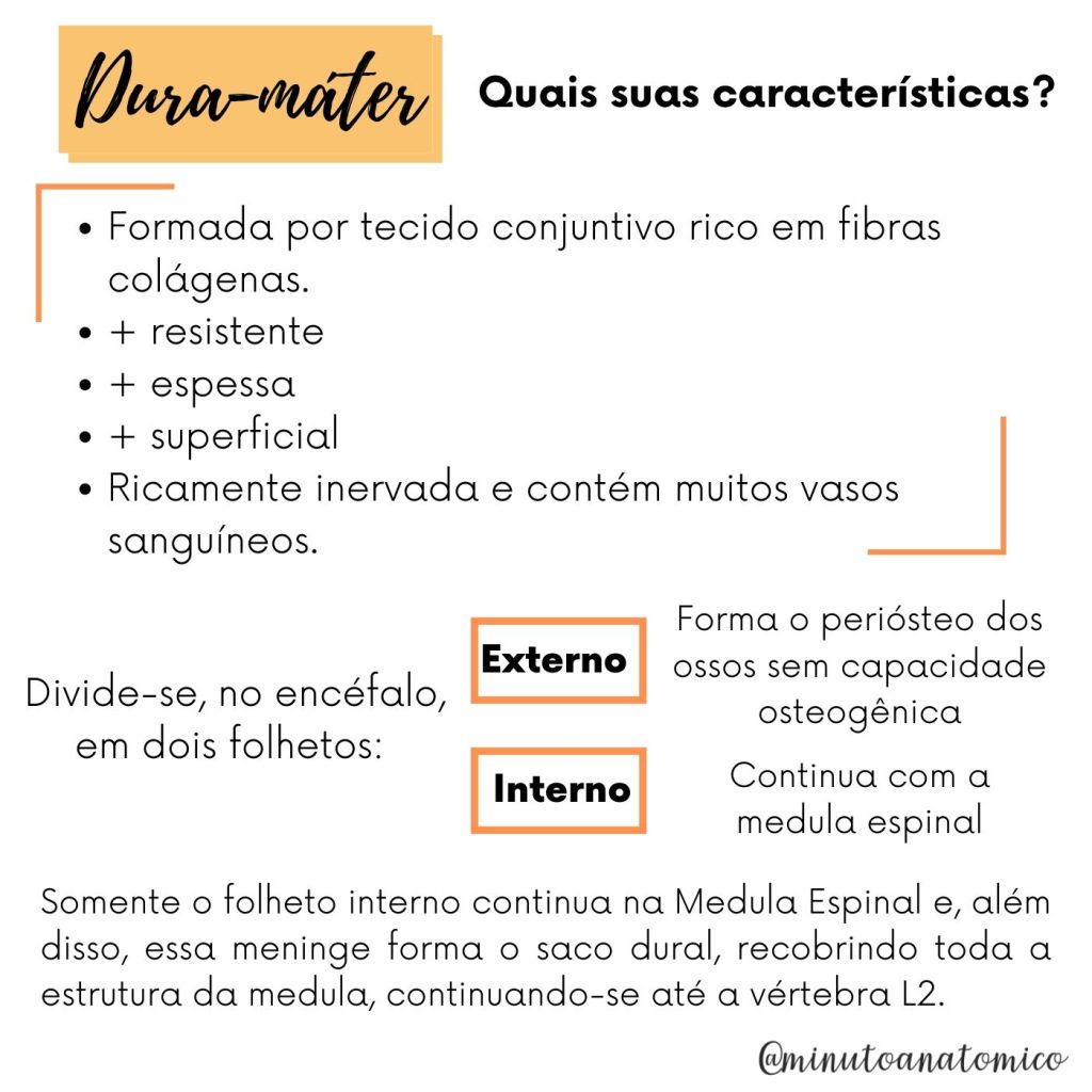 - A dura-máter é altamente inervada, ao contrário das outras meninges. Possui diversas estruturas derivadas, como as pregas e os seios da dura-máter, importantes para drenagem do sangue.