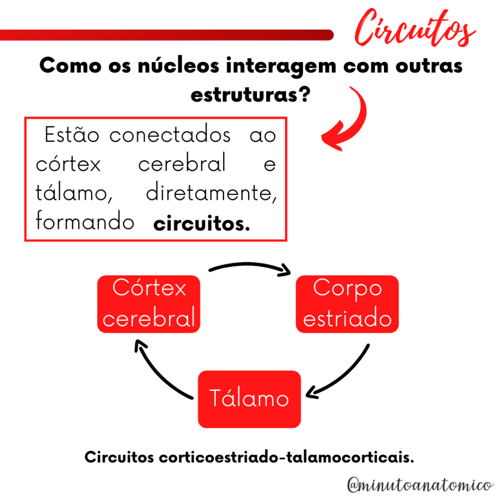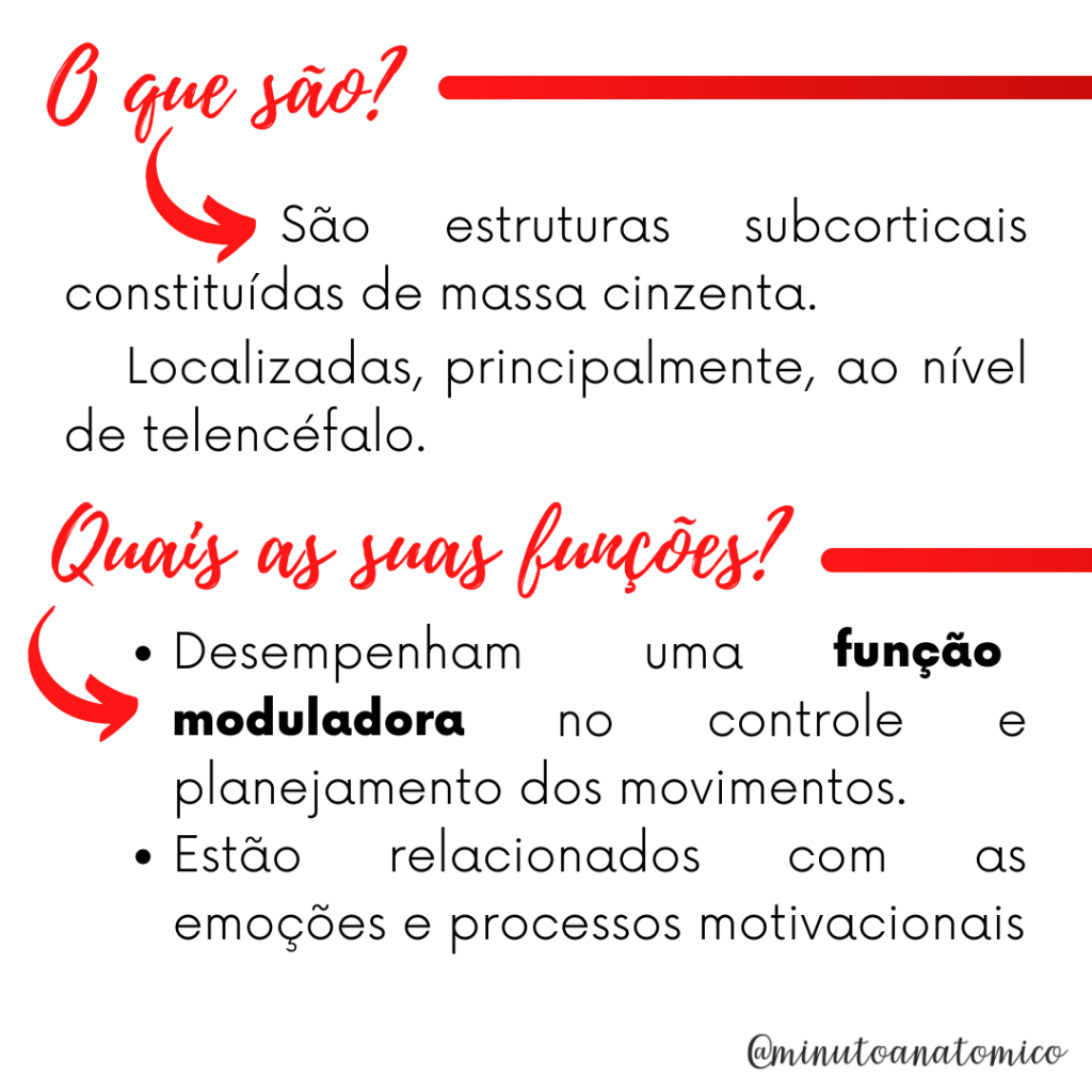 São estruturas diretamente relacionadas ao controle motor, fazendo com que lesões nestes núcleos resultem em distúrbios de movimento, como a rigidez muscular causada pelo parkinsonismo e as hipercinesias como a doença de Huntington (Coreia), por exemplo.