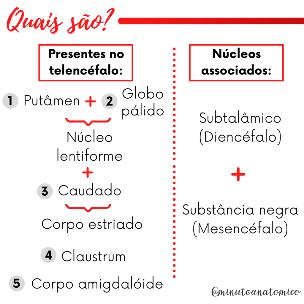 Os núcleos da base eram anteriormente reconhecidos como “gânglios da base” por conta da tradução literal do termo inglês “basal ganglia”. Entretanto, os gânglios são estruturas localizadas no Sistema Nervoso Periférico (SNP). Assim, o termo mais adequado para as estruturas descritas nesta publicação é “núcleos da base”. Estas podem ser divididas de acordo com a sua funcionalidade, em núcleos de entrada, núcleos de saída e núcleos intrínsecos.