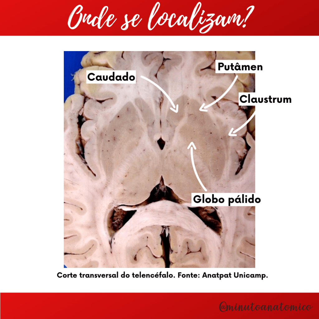 Existe certa confusão quanto às terminologias utilizadas para a caracterização desses núcleos, como Machado (2014) afirma: “O corpo estriado, também chamado corpo estriado dorsal, é constituído pelo núcleo caudado, putâmen e globo pálido”. Machado também dividiu o corpo estriado em corpo estriado dorsal e corpo estriado ventral, sendo formado pelo núcleo accumbens e o núcleo basal de Meynert. Em Anatomia de Gray (2010) o corpo estriado é definido como uma estrutura que: “[…] consiste no núcleo caudado, no putame e no globo pálido”. Além disso, Anatomia de Gray (2010) também apresenta a divisão do corpo estriado em Neoestriado (núcleo caudado e putame) e Paleoestriado (globo pálido). Já Meneses (2015) uma outra definição: “O corpo estriado ou striatum compreende o núcleo caudado, o putame e o núcleo accumbens”. Ademais, recomendamos uma leitura mais aprofundada nas fontes citadas nas referências para uma compreensão mais abrangente.