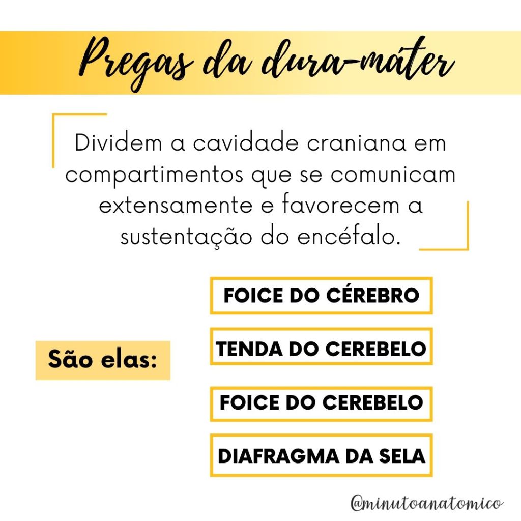 Vamos relembrar quais são as principais pregas da dura-máter? A dura-máter do encéfalo é formada por dois folhetos: um externo e um interno. O folheto externo é fortemente aderido à face interna dos ossos do crânio. O folheto interno, em determinadas áreas, destaca-se do externo, formando pregas e cavidades. A função das pregas da dura-máter é restringir o deslocamento do encéfalo associado à aceleração / desaceleração quando a cabeça se movimenta.