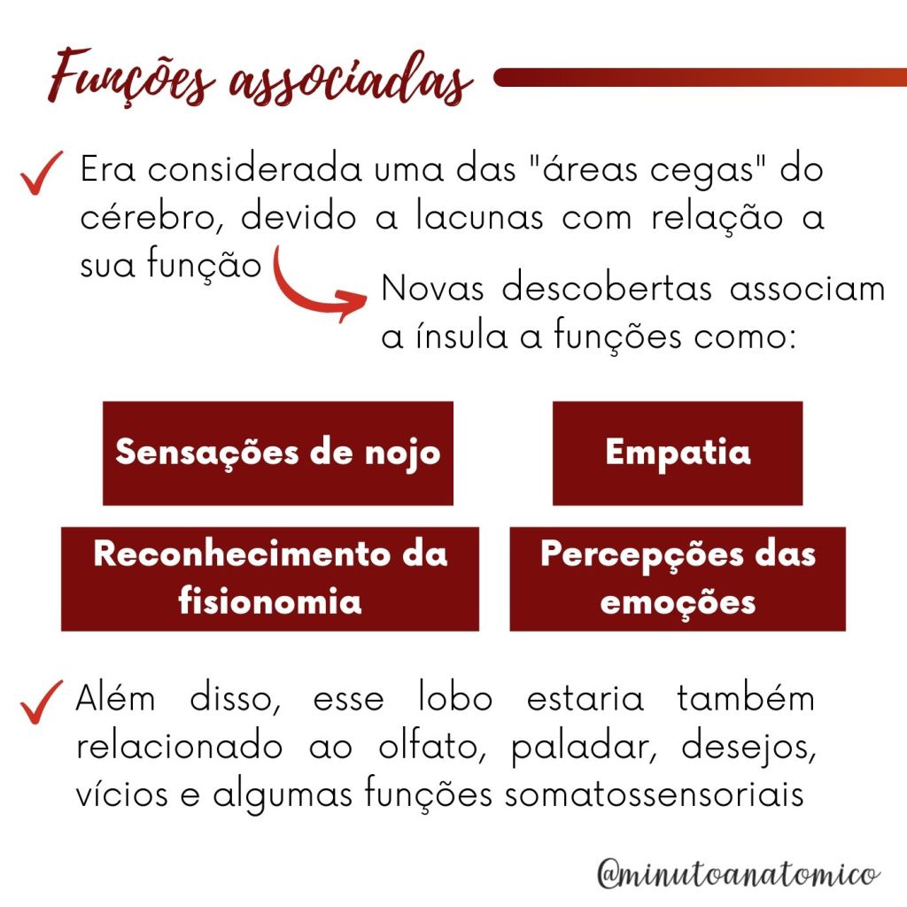 O córtex insular posterior é característico das áreas de projeções primárias, como as áreas gustativas e sensoriais viscerais. Enquanto isso, o córtex insular anterior está relacionado com as áreas de associação. Assim, estudos apostam a funcionalidade desta parte voltada para sentimentos de empatia, em conseguir se sensibilizar com os demais, para o reconhecimento da própria fisionomia do indivíduo, para as sensações de nojo ao se deparar com imagens que remetem a algo nauseante, além da percepção das emoções. Veja mais detalhes abaixo: