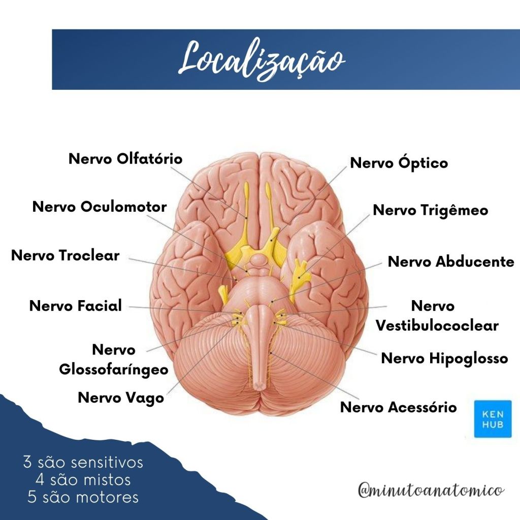 Os nervos cranianos correspondem aos 12 pares de “cordões” que ligam o encéfalo aos órgãos periféricos, e assim são denominados por emergirem ou penetrarem no crânio.