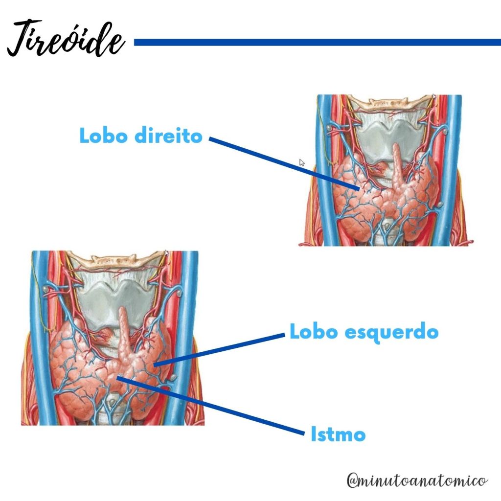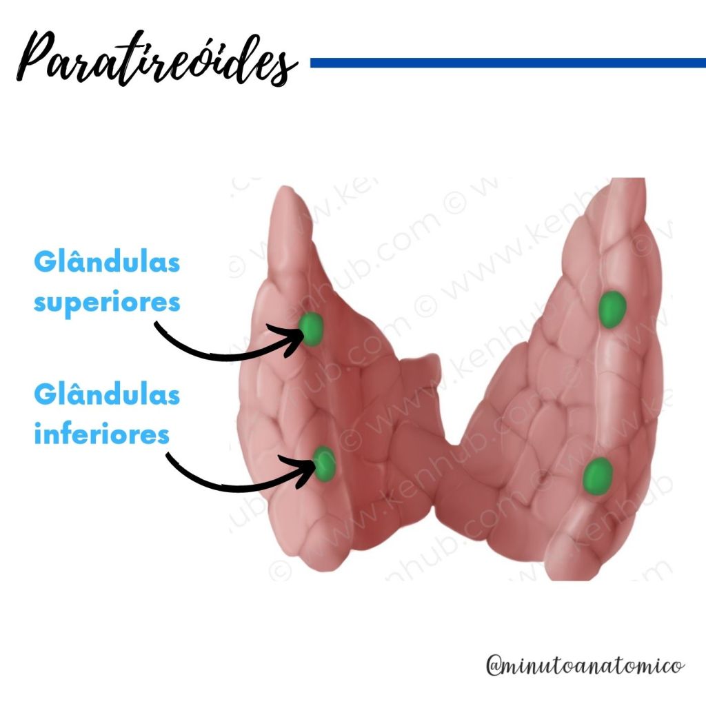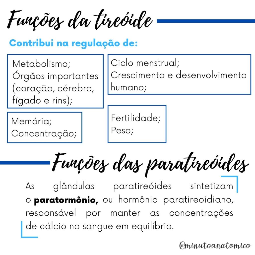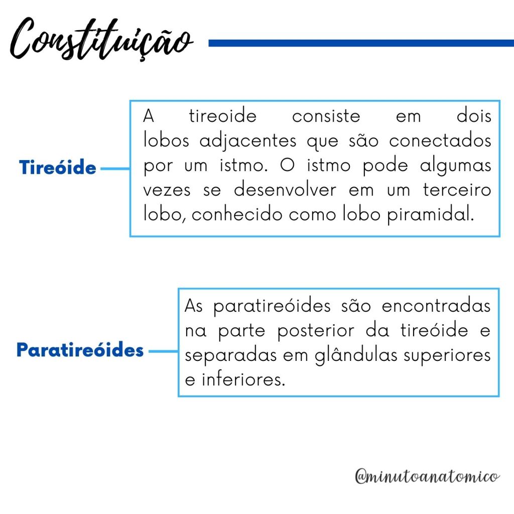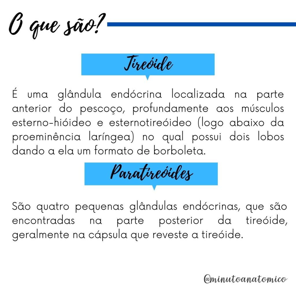 As glândulas tireoide e paratireoide correspondem a estruturas endócrinas do corpo humano que se localizam na parte anterior do pescoço. A tireoide tem um formato de borboleta ou “H”, sendo responsável pela produção dos hormônios T3 (tri-iodotironina), T4 (tiroxina ou tetraiodotironina) e a calcitonina. Já as paratireoides são formadas por quatro pequenas glândulas que se encontram na parte posterior da tireoide, as quais são responsáveis pela produção do paratormônio (PTH), que é responsável principalmente pelo aumento da concentração de cálcio no sangue. Veja mais informaçõezs abaixo: