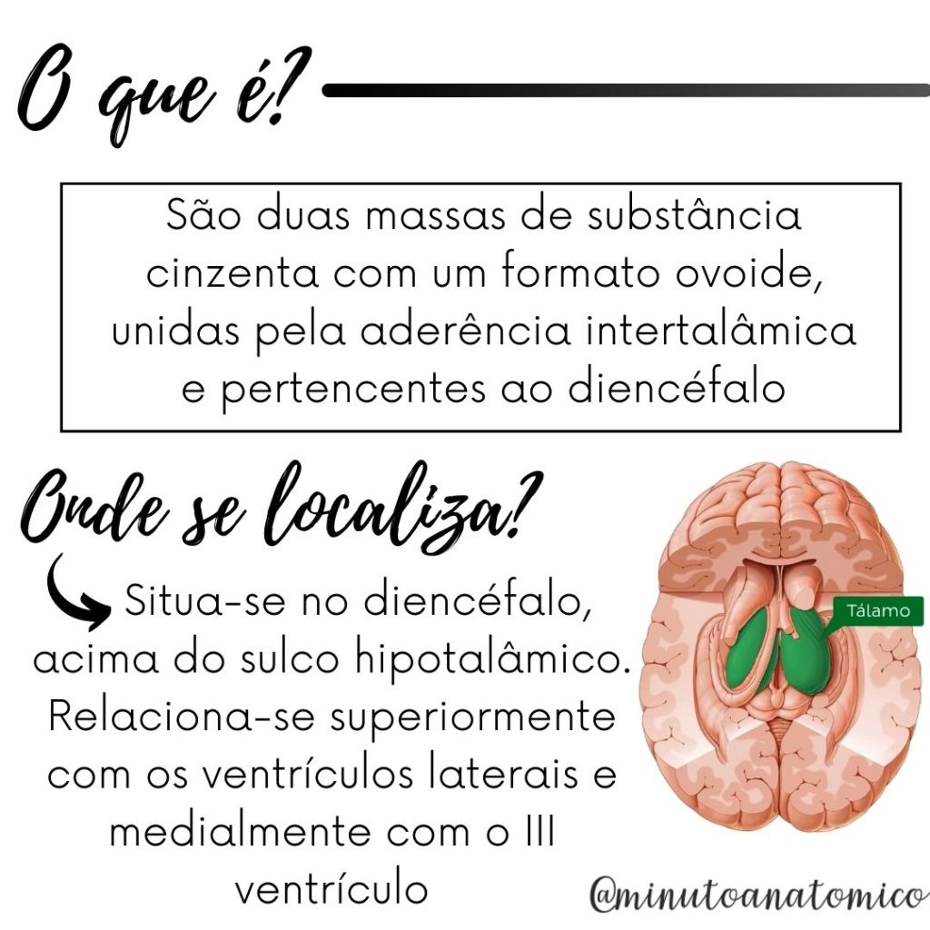 O tálamo é uma estrutura pertencente ao diencéfalo que se caracteriza por possuir duas grandes massas ovoides de substância cinzenta. Essa estrutura exerce importantes funções de transmissão das informações das várias vias que ali chegam, destinando tais informações ao córtex cerebral. Em outras palavras, o tálamo serve como uma porta de entrada para grande parte das informações que se dirigem ao córtex cerebral.