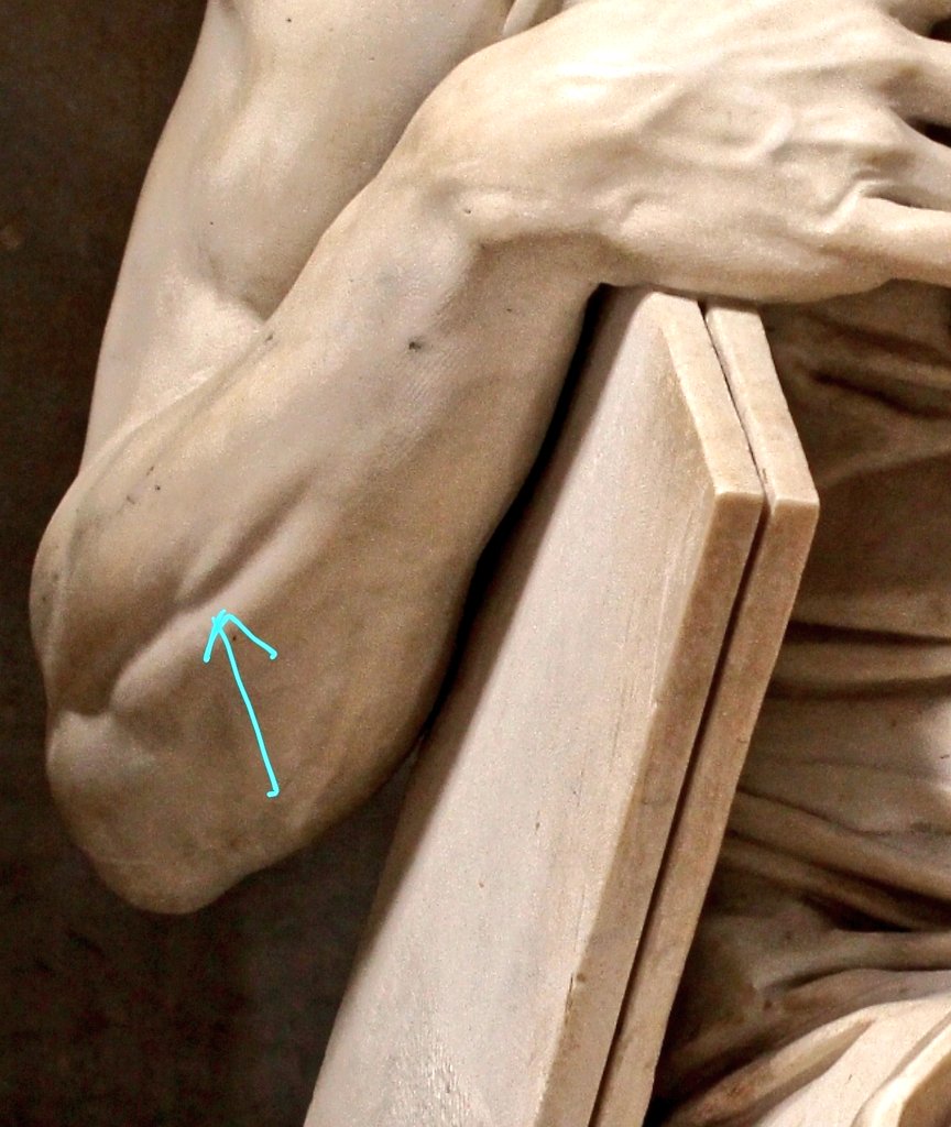 A genialidade de Michelangelo e seu domínio da Anatomia pode ser evidenciado num simples detalhe. O pequeno músculo fusiforme extensor do dedo mínimo, que se origina no epicôndilo lateral do úmero e dirige-se até o quinto dedo, juntamente com o extensor do dedos, é nitidamente observado em contração no antebraço de Moisés. Isto ocorre pois na obra, Moisés levemente estende o dedo mínimo (vide figura abaixo).