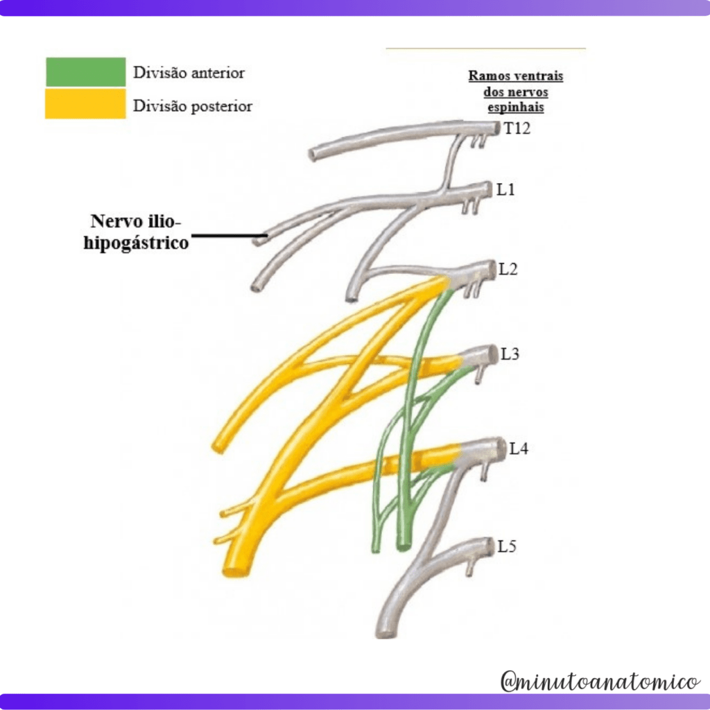 O plexo lombar está intimamente relacionado ao músculo psoas maior, situando-se anteriormente aos processos transversos das três primeiras vértebras lombares. É constituído pelos ramos ventrais dos nervos espinais de L1, L2, L3 e L4; e em 50% dos indivíduos, recebe contribuição do último nervo torácico – o nervo subcostal. Veja mais detalhes a seguir.