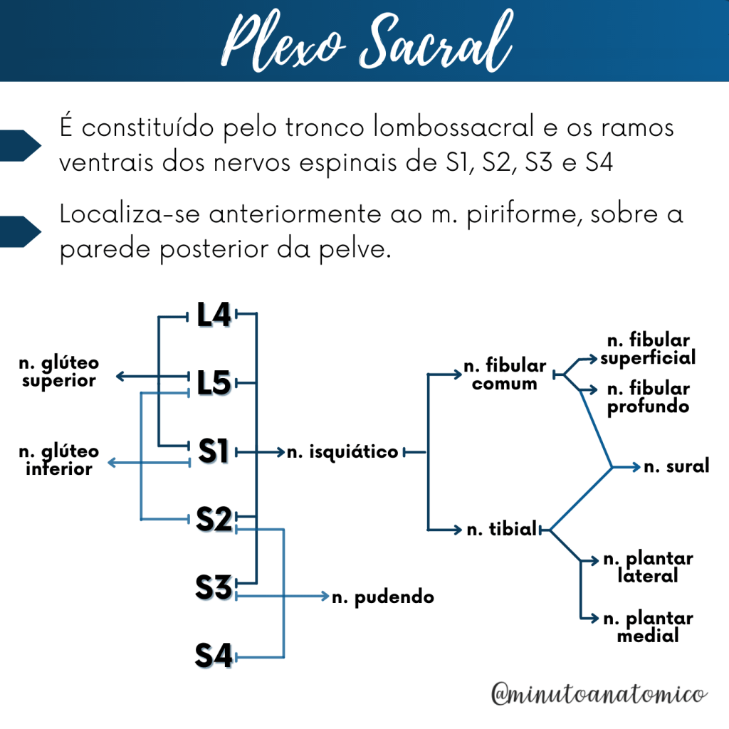 Plexos são redes nervosas formadas pela anastomose de alguns ramos ventrais dos nervos espinais.O plexo sacral forma nervos que se dirigem para a região glútea, períneo e membros inferiores. Quer aprender mais sobre a origem, trajetória e inervação dos principais nervos provenientes desse plexo? Confira nossa publicação!