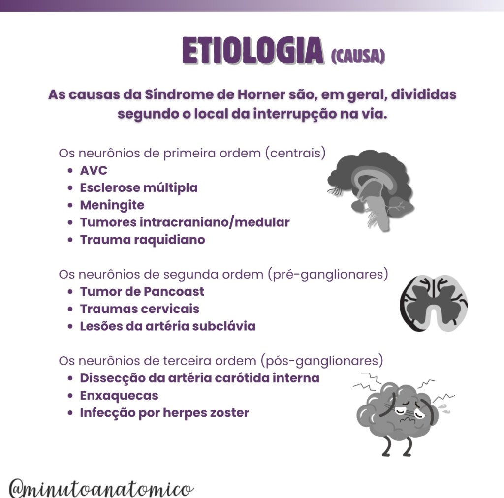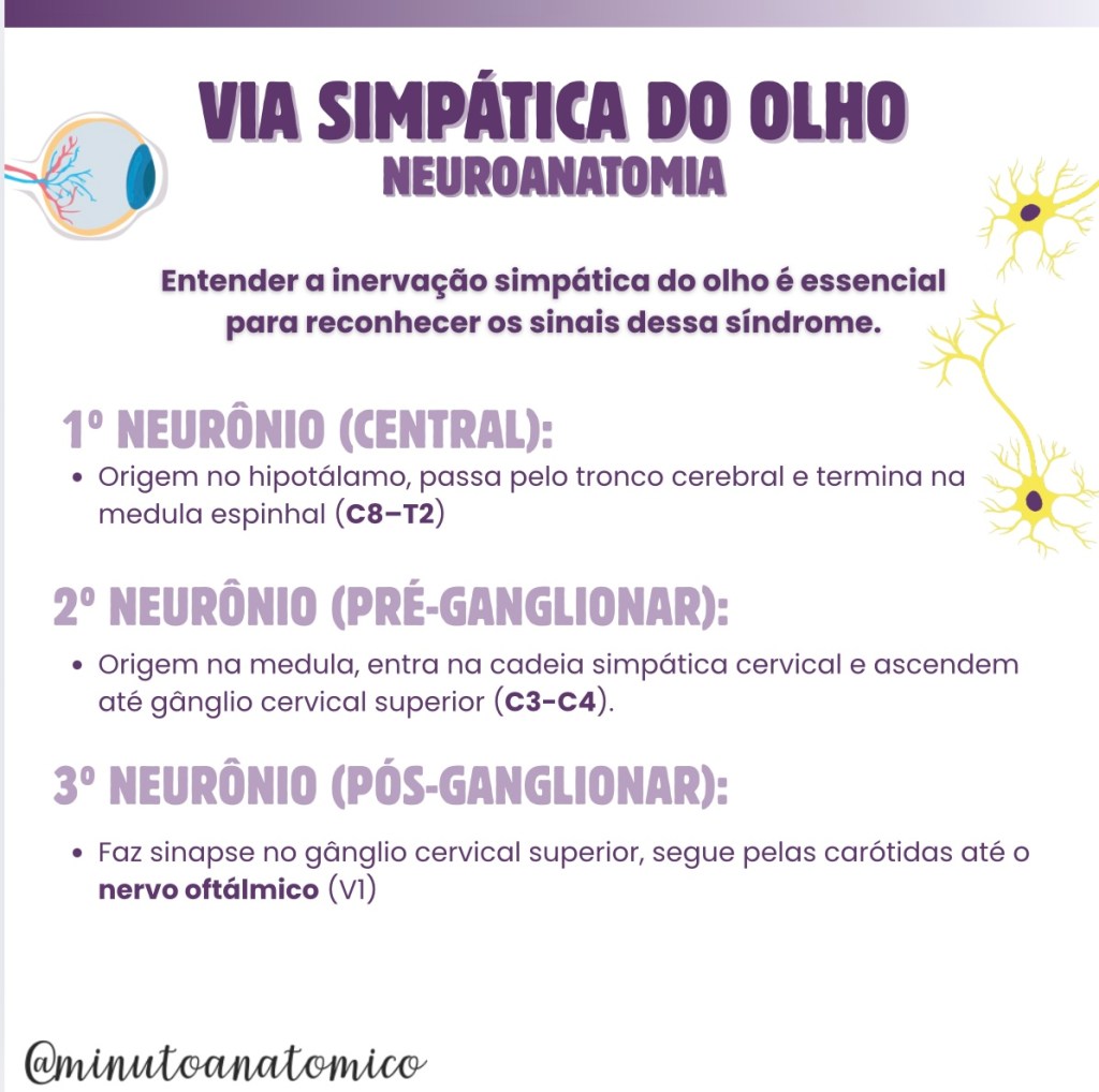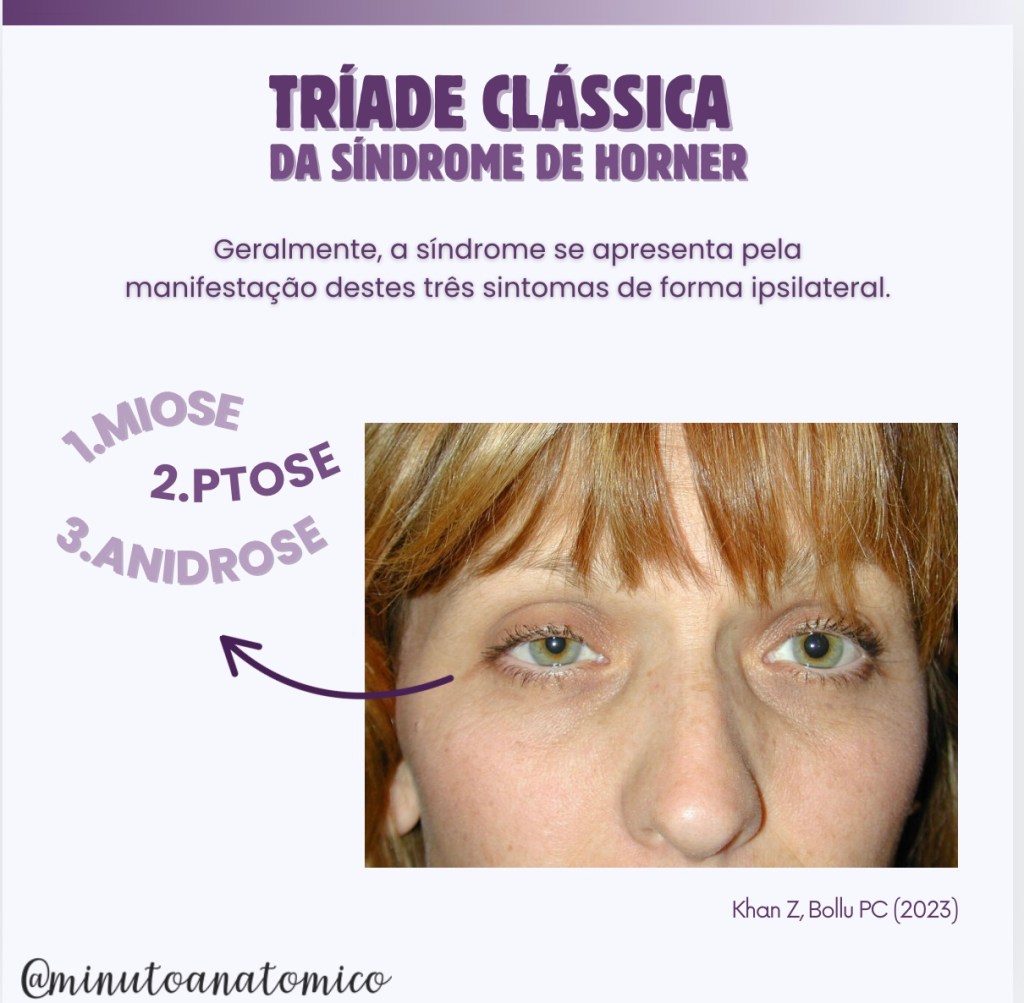 Khan Z, Bollu PC. Síndrome de Horner. [Atualizado em 10 de abril de 2023]. Em: StatPearls (Internet). A Ilha do Tesouro (FL): StatPearls Publishing; jan. de 2025. Disponível em: https://www.ncbi.nlm.nih.gov/books/NBK500000/