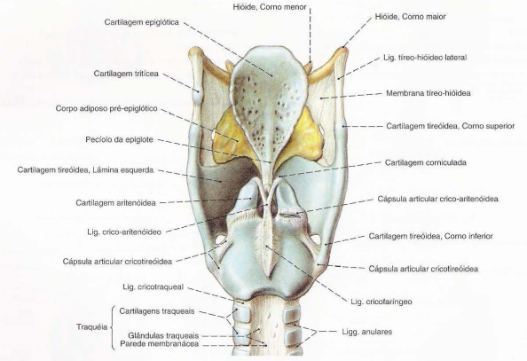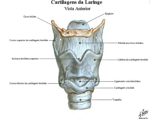 A laringe é o órgão responsável pela fonação, além de servir como um esfíncter para a proteção das vias e tubo por onde há a passagem de ar. Estendendo-se da laringofaringe a traqueia, a laringe é composta por nove cartilagens.