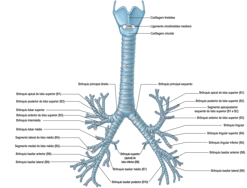 A partir da bifurcação traqueal, dois tubos são originados e cada um segue para um dos pulmões, são os brônquios principais, que logo se ramificam em outros.