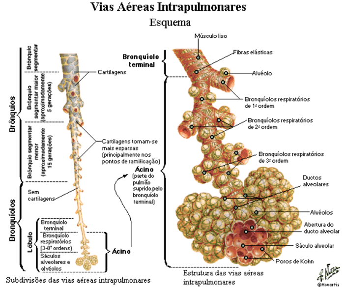 - Os brônquios segmentares correspondem aos de 3ª ordem, oriundos das várias divisões dos brônquios lobares. Eles se subdividem, inicialmente, em bronquíolos terminais que se continuam em ramos finais chamados de bronquíolos respiratórios ou alvéolos, locais vascularizados pelos capilares onde ocorre o processo da hematose.