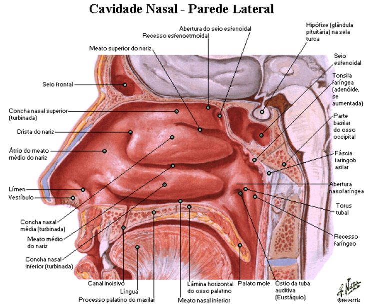 1.2. Cavidade nasal: é uma cavidade localizada acima da cavidade bucal (assoalho), com um teto oco formado pelo osso esfenoide, com uma parede medial sendo formada pelo septo nasal que separa a cavidade em um compartimento direito e esquerdo, e por uma parede lateral, constituída pelas conchas e meatos nasais, revestidos pela mucosa nasal.
