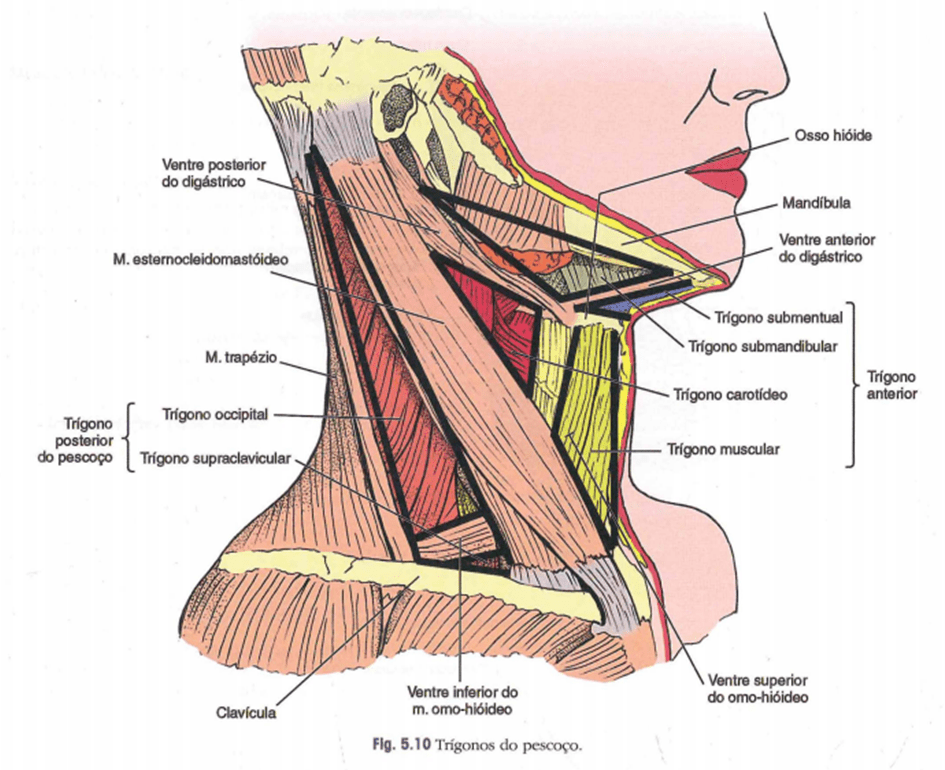 Trígono Carotídeo: É uma área assim denominada por conter a artéria carótida comum e seus ramos. É limitado pelo ventre superior do omo-hióideo, ventre posterior do digástrico e pela margem anterior do m. esternocleidomastóideo. O trígono carotídeo é coberto pela pele, pela fáscia superficial, pelo platisma e pela fáscia profunda, contendo o ramo cervical do nervo facial (profundamente) e ramos do nervo cervical transverso (superficialmente). Partes dos músculos tireo-hióideo, hioglosso e constritores inferior e médio da faringe formam seu assoalho.
