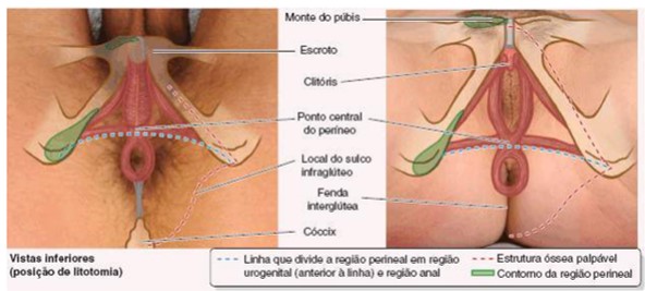Na posição anatômica, a superfície do períneo — a região perineal — é a região estreita entre as partes proximais das coxas; entretanto, quando os membros inferiores são abduzidos, é uma área rombóide que se estende do monte do púbis anteriormente em mulheres, das faces mediais (internas) das coxas lateralmente, e as pregas glúteas e a extremidade superior da fenda interglútea posteriormente.