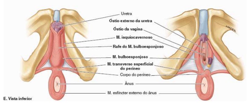 Os músculos transverso superficial do períneo, bulboesponjoso e esfíncter externo do ânus, por meio de sua fixação comum ao corpo do períneo, formam feixes cruzados sobre a abertura inferior da pelve para sustentar o corpo do períneo.