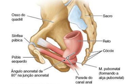 O músculo levantador do ânus é afunilado e perfurado no centro pelo canal anal, e o músculo puborretal, que tem formato de U, forma uma alça ao redor do “bico do funil”. A contração tônica do M. levantador do ânus causa o encurvamento anterior do canal anal.