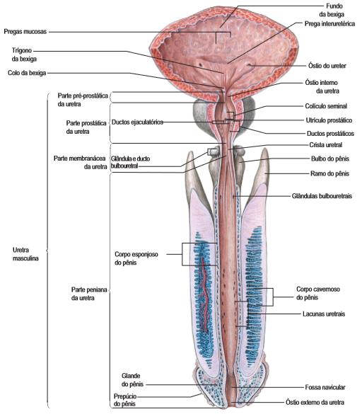 A parte intramural da uretra masculina (0,5 – 1,5 cm) estende-se do colo da bexiga até a próstata, possuindo o óstio interno da uretra, que impede a passagem do sêmen para a bexiga e pequenas glândulas periuretrais. A porção prostática (3 – 4 cm) percorre a próstata internamente e é onde os ductos ejaculatório e prostático desembocam. A uretra membranácea (1 – 1,5 cm) contém as glândulas e os ductos bulbouretrais, mas é na parte esponjosa (~ 15 cm) onde se abrem as glândulas bulbouretrais, essa parte da uretra está localizada no corpo esponjoso do pênis, que contém a fossa navicular. Por fim, o trajeto finaliza-se no óstio externo da uretra masculina, que fornece o controle voluntário à micção.