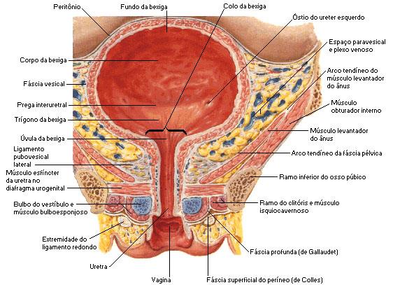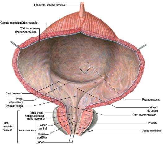 A região triangular de mucosa lisa existente no assoalho da bexiga é denominada “trígono da bexiga”. Ela é delimitada posterolateralmente pelos óstios dos ureteres, inferiormente pelo óstio interno da uretra – orifício que forma o ápice do trígono e situa-se no colo da bexiga; superiormente pela crista interuretérica e centralmente pela elevação chamada de úvula da bexiga, esta é maior em homens idosos devido o aumento da próstata.