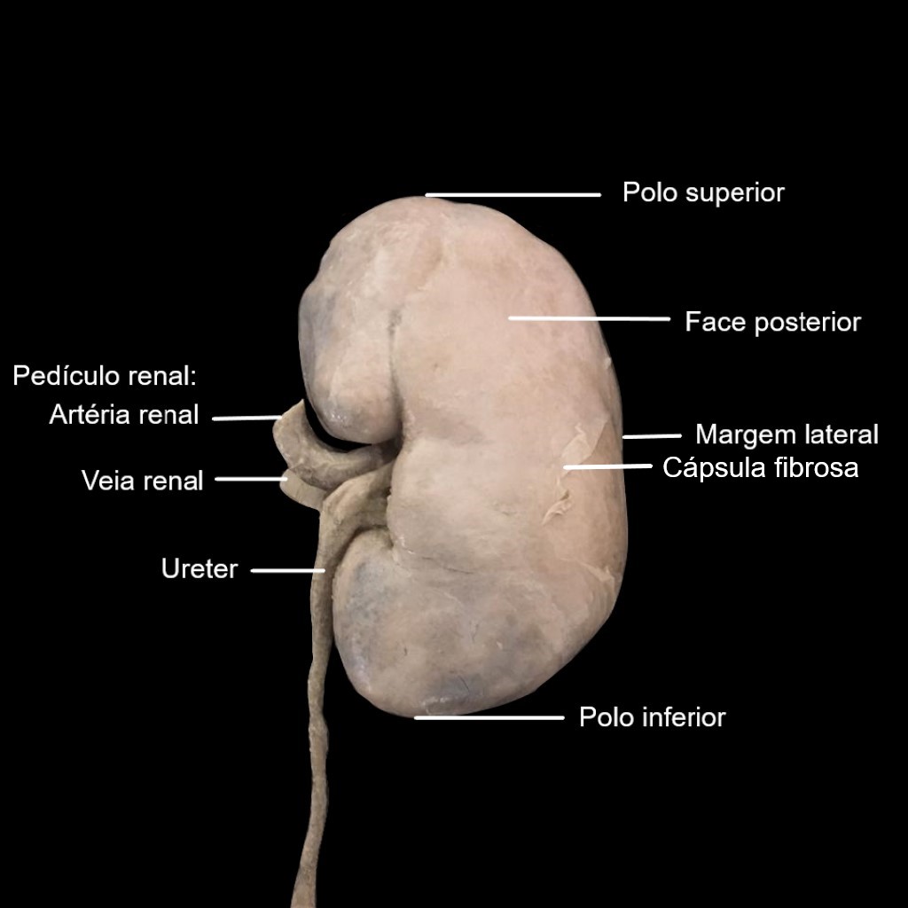 Aparentando um grão de feijão (estrutura faseoliforme), cada rim possui uma face anterior, correspondendo a superfície abaulada e orientada anterolateralmente; uma face posterior, plana e posteromedial; um polo superior, espesso e arredondado, onde há a glândula suprarrenal; um polo inferior, mais delgado; uma margem lateral (convexa) e uma margem medial (côncava).