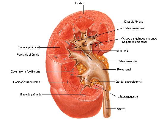 O rim apresenta um córtex, a região mais periférica e clara; colunas renais, sendo as extensões do córtex presentes entre as pirâmides; a medula, região interna mais escura e que contém as pirâmides e colunas; as pirâmides têm formato de cone, de modo que sua base está voltada para o córtex, e seu ápice para as papilas renais; os lobos renais incluem uma pirâmide e uma região do córtex; os cálices renais maiores são formados por 3 cálices menores, de modo que cada cálice menor abriga a papila renal de uma pirâmide; e um seio renal a abrigar toda a pelve renal, que afunila-se e continua como ureter.